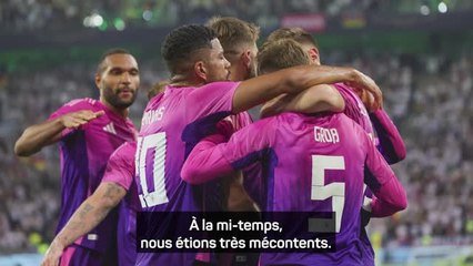 Julian Nagelsmann a aimé la réaction de ses hommes. « J'ai trouvé que la réaction en deuxième période était bonne. Bien sûr, nous avons discuté à la mi-temps, conscients qu'il s'agissait d'un match de préparation, et du dernier test (avant l'Euro). Ce n'est pas un parcours du combattant pour les joueurs, a souligné le sélectionneur allemand. Il faut simplement placer les choses dans la bonne perspective, du point de vue de l'entraîneur. Les joueurs veulent simplement gagner. On l'a vu en deuxième période, mais personne ne veut se blesser non plus. C'est aussi un sujet normal, puisqu'il s'agit du dernier test. La Grèce n'avait aucune pression. Ils ne participent pas au tournoi et peuvent jouer librement, de surcroît avec un entraîneur intérimaire, c'est une situation complètement différente. »