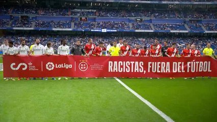 Un soutien affirmé dès l'échauffement. Sur la pelouse du Santiago Bernabeu ce mercredi soir, les joueurs du Real Madrid ont arboré des maillots avec le nom "Vini JR" et le numéro 20 du Brésilien. Référence évidente aux récentes insultes subies par le Brésilien à Mestalla. Bien que son carton rouge ait été annulé, l'ailier n'a pu jouer face au Rayo Vallecano mais s'est présenté devant le public avant d'aller rejoindre son président, Florentino Perez, en s'asseyant à côté de lui. Juste avant le coup d'envoi de la rencontre, une banderole contre le racisme a été tenue par les joueurs des deux équipes et les arbitres ("racistes, hors du football") tandis que le Bernabeu a affiché une banderole de soutien. "Vinicius somos todos, basta ya" ("Nous sommes tous Vinicius, ça suffit").
