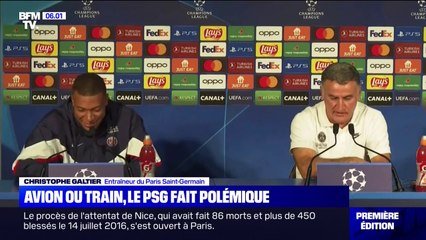 La séquence a animé les réseaux sociaux toute la soirée. Lundi, à 17h45, dans l'amphithéâtre du Parc des Princes, Christophe Galtier s'est présenté avec Kylian Mbappé pour la traditionnelle conférence de presse de veille de match, à un peu plus de 24h du choc entre le PSG et la Juventus en ouverture de la phase de poules de la Ligue des champions. Et l'entraîneur parisien a été interrogé sur le tacle de la SNCF, dont le directeur de TGV-INTERCITÉS, Alain Krakovitch, a réitéré sur Twitter sa proposition d'offre TGV pour le PSG, qui s'est déplacé à Nantes en jet privé samedi, et rappelé que ce trajet ne prenait que deux heures en train. Mbappé et Galtier se sont alors esclaffés, et ce dernier a tenté de répondre avec humour : "Je me doutais que l'on allait avoir cette question-là. Pour être très honnête avec vous, ce matin, on a parlé avec la société qui organise nos déplacements. On est en train de voir si on ne peut pas se déplacer en char à voile !"