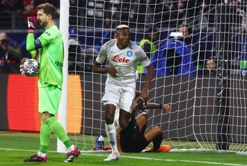Le Napoli va continuer de faire très mal à son adversaire sur cette fin de première période. Après un ballon récupéré par Stanislav Lobotka à 60 mètres, Hirving Lozano est lancé comme une fusée sur l'aile droite. Son centre tendu trouve Victor Osimhen au second poteau, qui marque avec un peu de réussite à bout portant et en terminant, lui aussi, au fond des filets (0-1, 40 e ). Le Nigérian a cru inscrire un doublé deux minutes plus tard sur une copie quasi conforme de l'ouverture du score. Sur une nouvelle perte de balle de Francfort à 35 mètres, Lozano, encore lui, permet à Osimhen de marquer, mais il est signalé en position de hors-jeu (42 e ). Intenable, l'ancien Lillois va encore bouger tout le monde sur un service de Kvaratskhelia, mais Mario Götze effectue un retour salvateur, forçant l'attaquant à frapper dans le petit filet extérieur (46 e ).