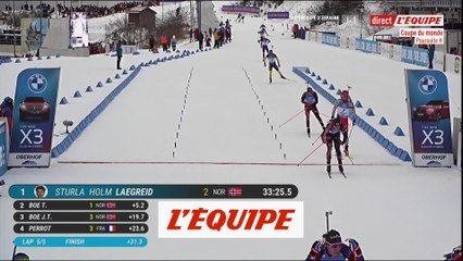La France avait de bonnes raisons de croire à un nouveau triplé après la splendide performance de la veille signée Quentin Fillon Maillet, Fabien Claude et Émilien Jacquelin. Malheureusement, comme un peu plus tôt chez les femmes, le tir a fait défaut aux Bleus. Et contrairement aux Françaises, les Français n'ont eux pas réussi à installer un des leurs sur la plus haute marche du podium. Ce samedi après-midi, la Norvège a pris sa revanche en plaçant trois compatriotes sur les cases dans l'ordre suivant : Sturla Laegreid, Tarjei Boe et Johannes Boe. À l'occasion de cette poursuite et malgré l'avance des Tricolores, les Scandinaves ont fait parler leur régularité au tir puisque les trois premiers du jour ont respectivement commis 2, 1 et 3 fautes contre 3 pour Éric Perrot, 5 pour Quentin Fillon Maillet, 5 pour Émilien Jacquelin, 3 pour Émilien Claude ou encore 5 pour Fabien Claude. Pour ce dernier, qui a débuté par un zéro faute lors des deux premières sessions, c'est plus frustrant même s'il a montré qu'il pouvait jouer la gagne.