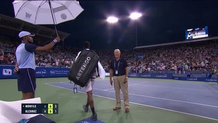 Avec Alcaraz en face au match suivant, Monfils s'est attaqué à un beaucoup plus gros morceau que l'Australien ayant surpris tous les pronostiqueurs au Canada. Cela a surtout sauté aux yeux dans le premier set, qui a vu le joueur entraîné par Juan Carlos Ferrero se détacher rapidement et profiter finalement de cet unique break pour basculer avec un set d'avance. En revanche, dans le deuxième set, les deux joueurs ont fait jeu égal et se sont rendu coup pour coup malgré de nombreuses occasions de breaker, tout particulièrement en faveur du Français, qui s'est même procuré une balle de set à 6-5. Finalement, il faudra un jeu décisif pour les départager dans cette deuxième manche. Avant que la pluie ne vienne le couper dans son élan, Monfils semblait le mieux placé pour le remporter. Dénouement ce vendredi.