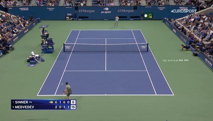 L'Italien a remporté la première manche grâce à deux breaks à 1-1 et 4-2 (tout en sauvant trois balles de break), avant de perdre ses moyens dans le deuxième, où Medvedev lui a pris son service à 1-0 et 3-0 et a sauvé deux balles de débreak. Mais le trou d'air de Sinner n'a pas duré longtemps. Dans la troisième manche, il a rendu la monnaie de sa pièce au Russe, en menant 5-0 à son tour, avant d'empocher le set sur sa quatrième occasion, à 5-1. Le cinquième s'est avéré bien plus disputé. Les deux joueurs ont facilement conservé leur mise en jeu, jusqu'à 3-2 en faveur de Medvedev. C'est alors que le Russe s'est procuré deux balles de 4-2 sur le service de Sinner, mais l'Italien les a sauvées, et c'est lui qui a réussi le break sur le jeu suivant (4-3). A 5-3, il a eu une balle de match sur le service de Medvedev, sauvée par le Russe. Mais le n°1 mondial n'a pas manqué l'occasion de conclure sur son service, à 5-4. Le voici donc dans le dernier carré à l'US Open pour la première fois de sa carrière, à 23 ans, et il devient le quatrième joueur en activité à avoir disputé au moins une demie dans les quatre Grands Chelem, après Novak Djokovic, Rafael Nadal et Marin Cilic. Sinner, qui comptera au moins 2900 points d'avance sur son dauphin lundi (Alexander Zverev va devenir n°2 mondial pour la première fois), partira favori de sa demi-finale face à Jack Draper, même si le Britannique l'a battu lors de leur seule confrontation, sur le gazon du Queen's, en deux tie-breaks.