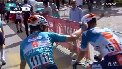 Mercredi, c'était Godon-Vendrame en Romandie. Jeudi, c'est Andresen-Jakobsen à Kusadasi. La DSM-Firmenich PostNL a signé un doublé relativement semblable à celui de Decathlon AG2R, lors de la 5e étape du Tour de Turquie. Tobias Lund Andresen, déjà vainqueur la veille et leader de l'épreuve, y a gagné devant Fabio Jakobsen. Voici le sprint final, en vidéo. Cette course est à suivre sur Eurosport. Les chaines Eurosport sont disponibles au sein des offres Canal+, Prime Video, Bouygues Telecom et Free avec TV by Canal