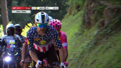 Découvrez les temps forts de la 3e étape du Tour de Suisse (Aarau-Heiden), remportée mardi par l'Américain Quinn Simmons.