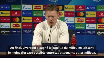 Leipzig a été éliminé en huitième de finale de la Ligue des champions après sa défaite contre Liverpool (0-2) à Budapest (Hongrie) ce mercredi (défaite 2-0 à l'aller). En conférence de presse d'après-match, l'entraîneur du club allemand Julian Nagelsmann est revenu sur le scénario de cette rencontre et sur la prestation de son équipe.