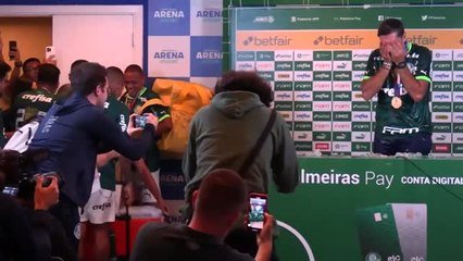 L'entraîneur de Palmeiras, Abel Ferreira, a été abondamment arrosé par ses joueurs lors de sa conférence de presse de fin de match, après la victoire en finale du championnat paulista contre Agua Santa ce dimanche (4-0).