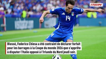 Blessé, Federico Chiesa a été contraint de déclarer forfait pour les barrages à la Coupe du monde 2026 que s'apprête à disputer l'Italie opposé à l'Irlande du Nord jeudi soir (20h45, en direct sur L'Equipe live foot). Il a été remplacé par l'ailier de Bologne Nicolo Cambiaghi.