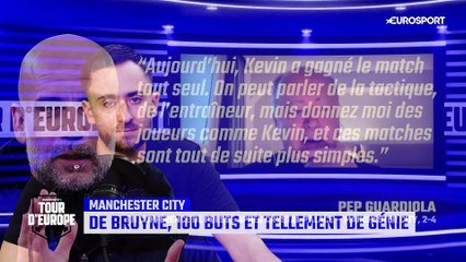 Kevin De Bruyne a inscrit ses 99e et 100e buts avec Manchester City sur la pelouse de Crystal Palace samedi (2-4). Une prestation majuscule de plus pour le milieu de terrain belge, que notre consultant Philippe Auclair place dans le gratin de l'histoire du football anglais. On en parle dans Tour d'Europe, ce lundi. Extrait en vidéo. [Réalisation : Simon Farvacque, Marko Popovic.] Les chaines Eurosport sont disponibles au sein des offres Canal+, Prime Video et Bouygues Telecom