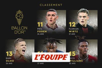 Nico Williams (Athletic Bilbao), Ademola Lookman (Atalanta), Dani Olmo (Leipzig / Barcelone), Florian Wirtz (Bayer Leverkusen) et Phil Foden (Manchester City) se classent de la 15e à 11e place du classement du Ballon d'Or 2024.