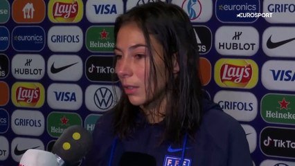 EURO 2022 - Entrée en cours de jeu, l'attaquante des Bleues Clara Matéo regrette l'élimination face à l'Allemagne, mercredi, en demi-finale de l'Euro 2022. Même si l'équipe de France a tenté jusqu'au bout, elle regrette qu'avec les grandes joueuses présentes, les Bleues ne parviennent pas à mieux jouer ensemble.