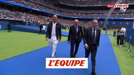 La légende du Real Madrid et des Bleus Zinédine Zidane vient de pénétrer sur la pelouse en compagnie du président Florentino Perez.