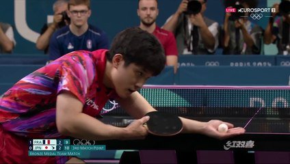 Quelle victoire de Félix Lebrun ! Embarqué dans un gros duel face au Japonais Harimoto, le Français a sauvé trois balles de match d'affilée dans la 5e manche pour permettre aux Bleus de mener 2-0, à une victoire de la médaille de bronze. Les JO de Paris 2024 sont sur Eurosport via MAX. Les chaines Eurosport sont disponibles au sein des offres Canal+, Prime Video, Bouygues Telecom et Free avec TV by Canal