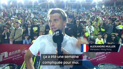 Alexandre Müller, après avoir encore perdu le premier set ce dimanche à Hong Kong, a fini par user le Japonais Kei Nishikori en finale pour emporter son premier titre sur le circuit (2-6, 6-1, 6-3). Après être devenu le deuxième joueur de l'histoire à remporter un tournoi en accusant un retard d'une manche à toutes les rencontres, le Français était aussi heureux qu'épuisé à la sortie du court.