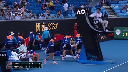 Très calme face à Nick Kyrgios et son public déchaîné au 2e tour de l'Open d'Australie, Daniil Medvedev s'est montré bien plus nerveux face à Maxime Cressy en 8e de finale lundi sur la Margaret Court Arena. Entre la chance de son adversaire, vainqueur du 3e set, et l'interdiction d'aller aux toilettes, le Russe a passé son temps à contester toutes ses mésaventures du jour, avant de se qualifier.